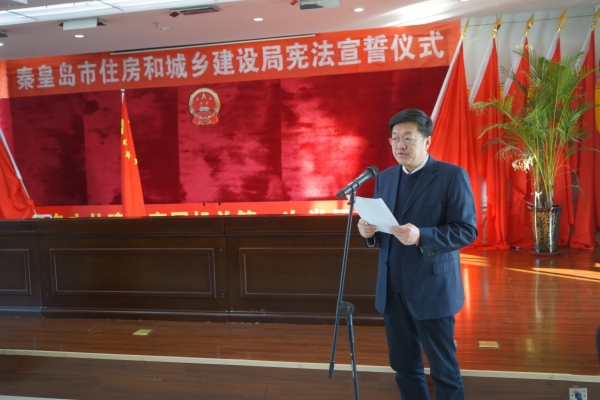 12月7日市住房和城乡建设局举行宪法宣誓仪式。党组书记、局长石兆旭参加宣誓仪式并讲话。宣誓仪式现场,国徽高悬,国旗庄严,宣誓台上摆放着《中华人民共和国宪法》。仪式主持人二级调研员杜立平宣布宪法宣誓仪式开始,全场起立,奏唱中华人民共和国国歌。随后,领誓人左手抚按宪法,右手举拳庄重领誓,宣誓人员面向国旗、国徽,列队站立,依法庄严宣誓:“我宣誓:忠于中华人民共和国宪法,维护宪法权威,履行法定职责,忠于祖国、忠于人民,恪尽职守、廉洁奉公,接受人民监督,为建设富强民主文明和谐美丽的社会主义现代化强国努力奋斗!”