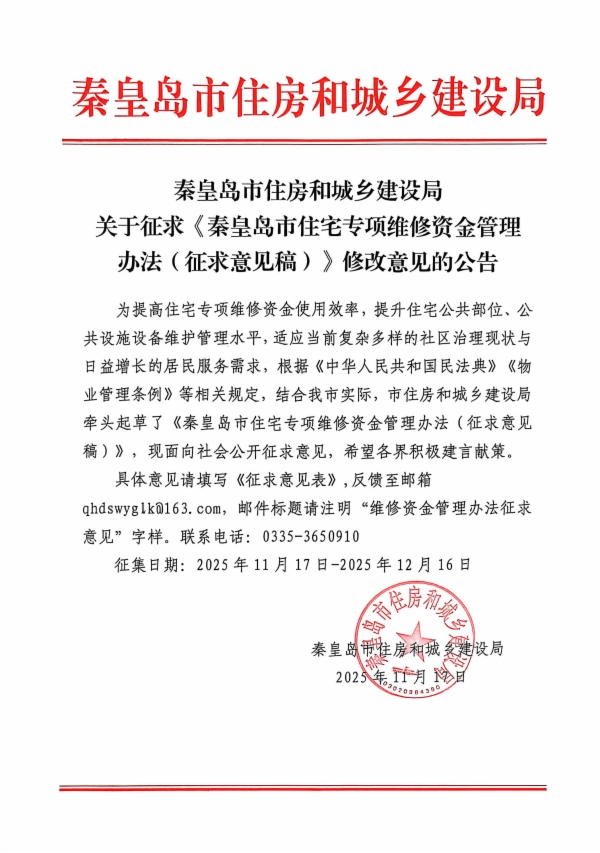 关于征求《秦皇岛市住宅专项维修资金管理办法(征求意见稿)》修改意见的公告