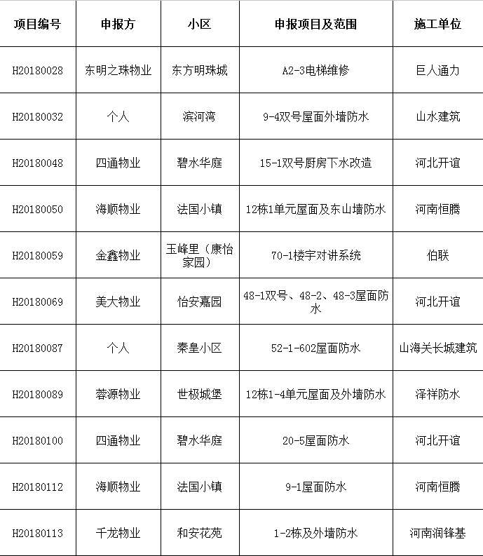 根据《住宅专项维修资金管理办法(建设部、财政部令第165号)》、《河北省住宅专项维修资金管理实施细则(冀建法【2011】788号)》及本市维修资金使用相关规定,本批次公示的项目均经申报单位/申报人申请、专有部分占建筑物总面积2/3以上的业主且占总人数2/3以上的业主签字确认、公示无异议,现准许施工,维修费用将从受益房屋坐落的业主住宅专项维修资金账户中列支。