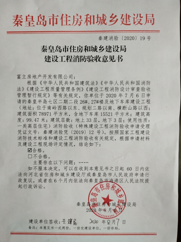 秦建消验﹝2020﹞19号建设工程消防验收意见书(秦皇半岛七区二期二段26#、27#楼及地下车库)