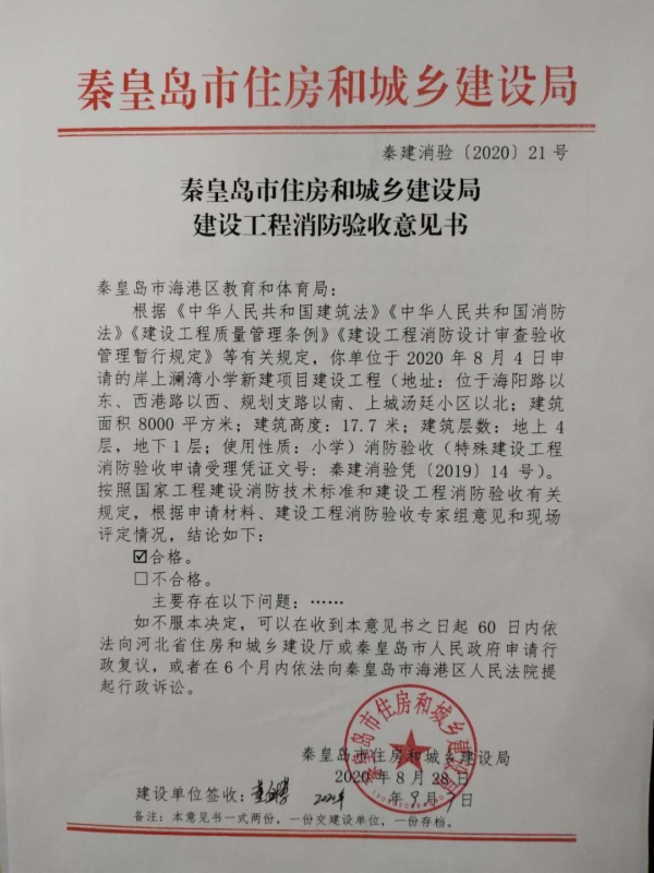 秦建消验〔2020〕21号建设工程消防验收意见书(岸上澜湾小学新建项目)