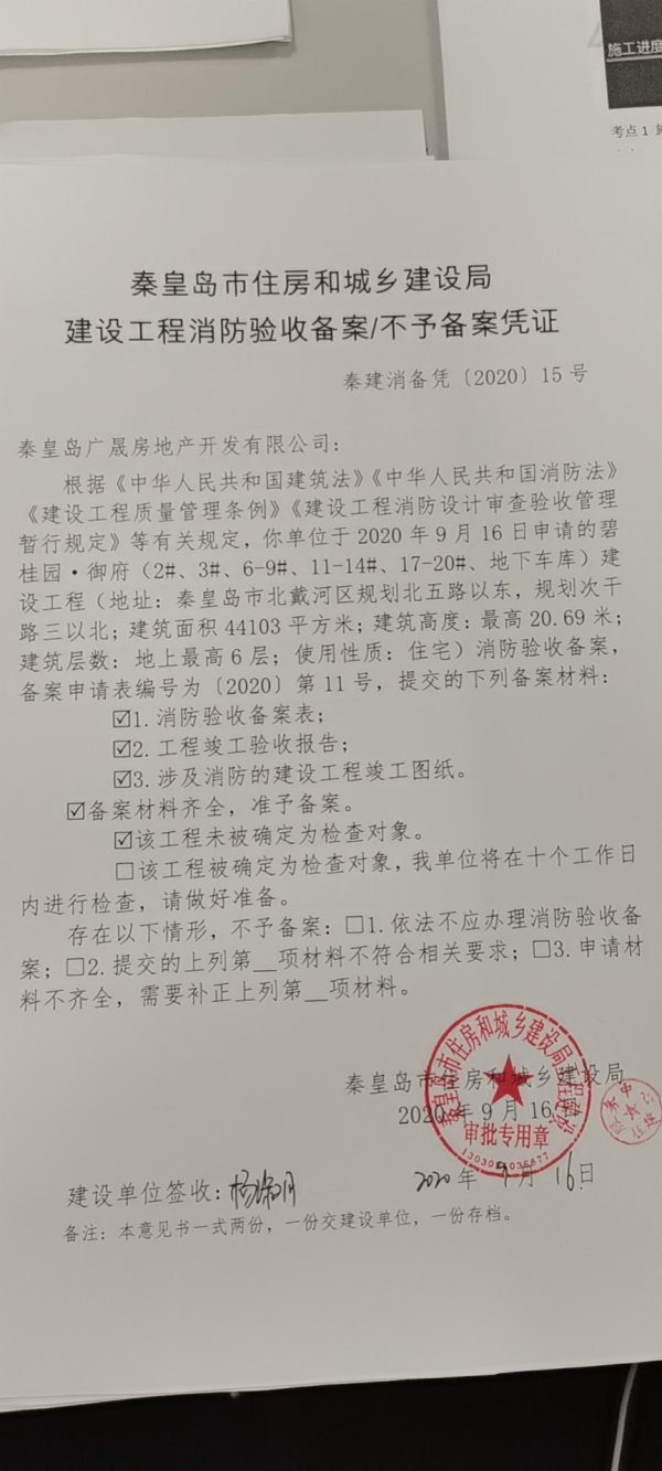 秦建消备凭〔2020〕15号建设工程消防验收备案凭证(碧桂园·御府2#、3#、6-9#、11-14#、17-20#、地下车库)