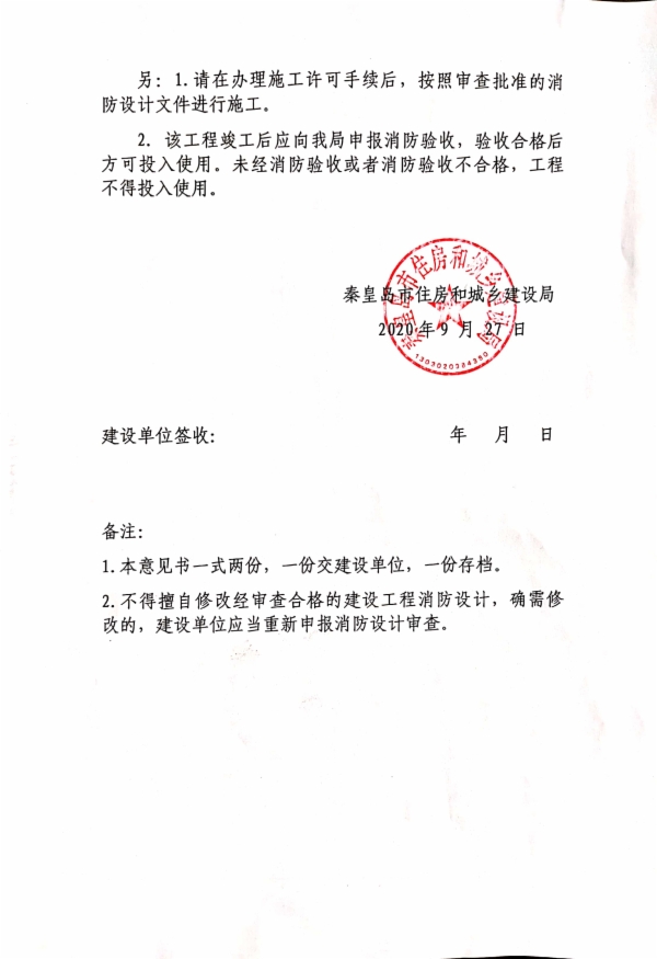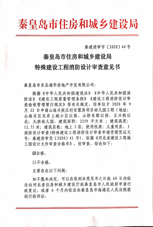 秦建消审字〔2020〕44号特殊建设工程消防设计审查意见书(山海关侯庄村安置房项目幼儿园)
