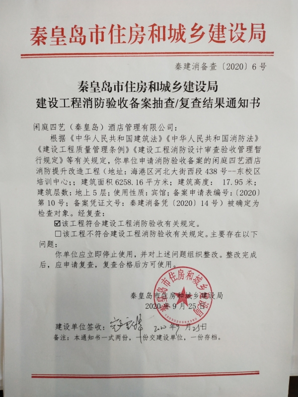秦建消备查﹝2020﹞6号建设工程消防验收备案抽查结果通知书(闲庭四艺酒店消防提升改造工程)