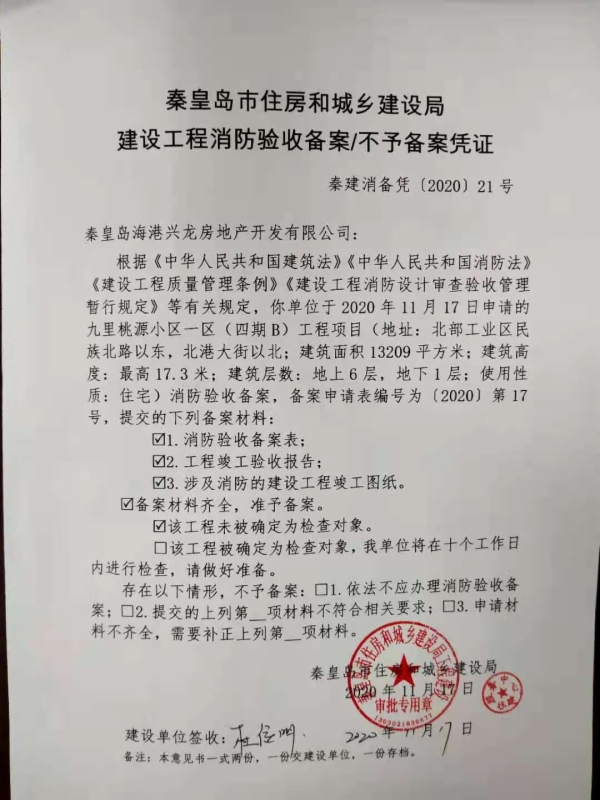 秦建消备凭〔2020〕21号 建设工程消防验收备案凭证(九里桃源小区一区(四期B))