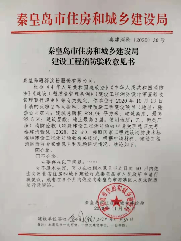 秦建消验〔2020〕30号建设工程消防验收意见书(淀粉2车间投料、清理改造工程)
