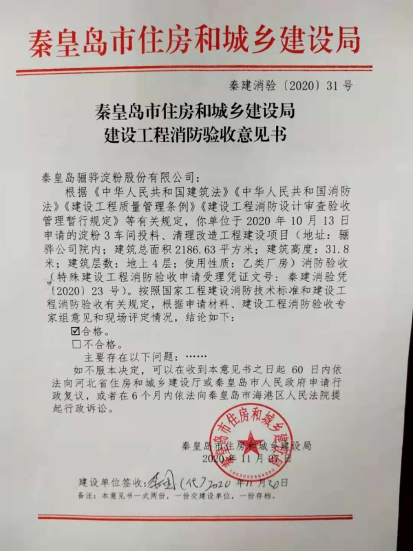 秦建消验〔2020〕31号建设工程消防验收意见书(淀粉3车间投料、清理改造工程)
