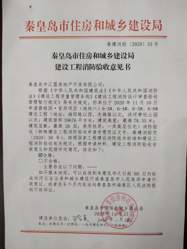 秦建消验〔2020〕33号建设工程消防验收意见书(碧桂园·首府项目(地块六)6-3#、6-4#、6-5#、6-6#建设工程)