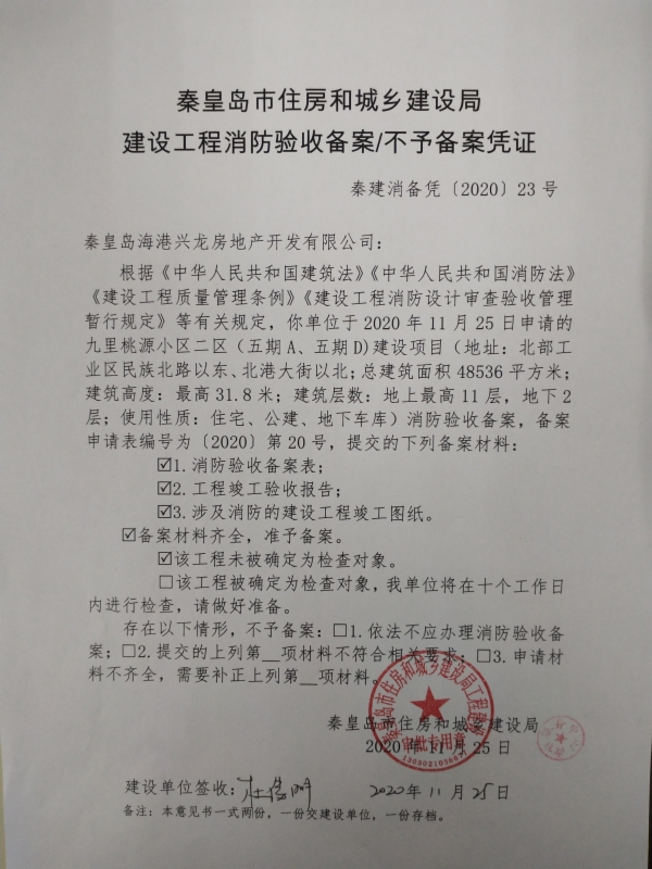 秦建消备凭〔2020〕23号 建设工程消防验收备案凭证(九里桃源小区二区(五期A、五期D)建设项目)