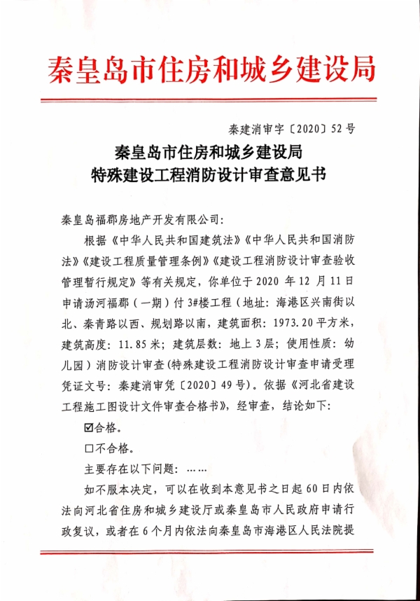 秦建消审字〔2020〕52号特殊建设工程消防设计审查意见书(汤河福郡(一期)付3#楼工程)