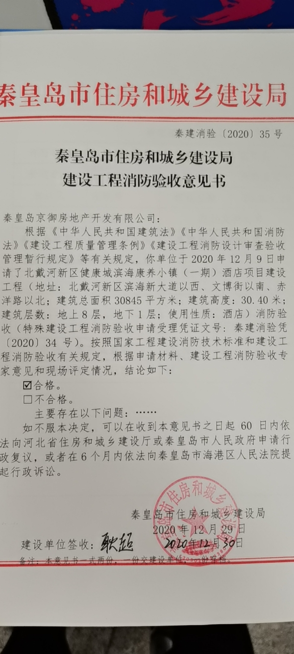 秦建消验〔2020〕35号建设工程消防验收意见书(北戴河新区健康城滨海康养小镇(一期)酒店项目)