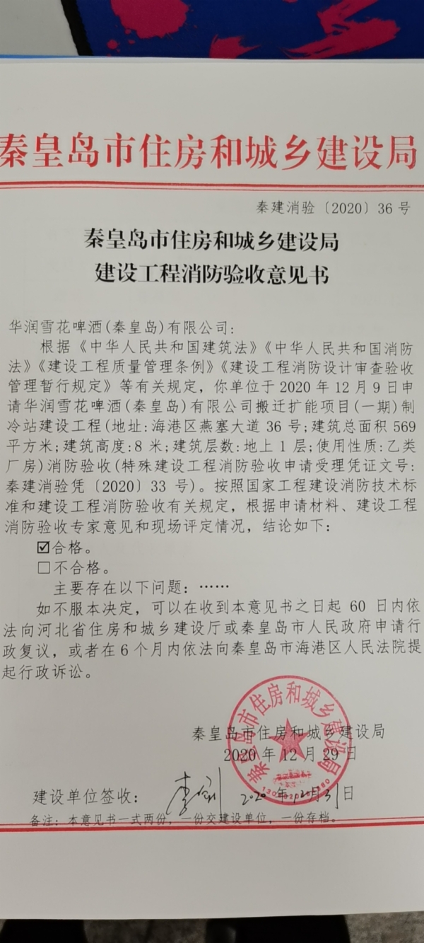 秦建消验〔2020〕36号建设工程消防验收意见书(华润雪花啤酒(秦皇岛)有限公司搬迁扩能项目(一期)制冷站建设工程)