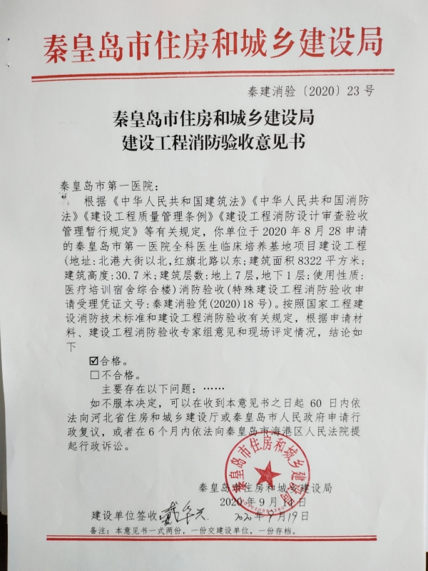 秦建消验﹝2020﹞23号建设工程消防验收意见书(秦皇岛市第一医院全科医生临床培养基地项目)