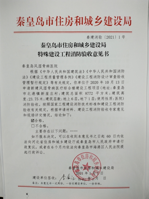 秦建消验﹝2021﹞1号建设工程消防验收意见书(新建风湿骨病医疗综合楼项目)