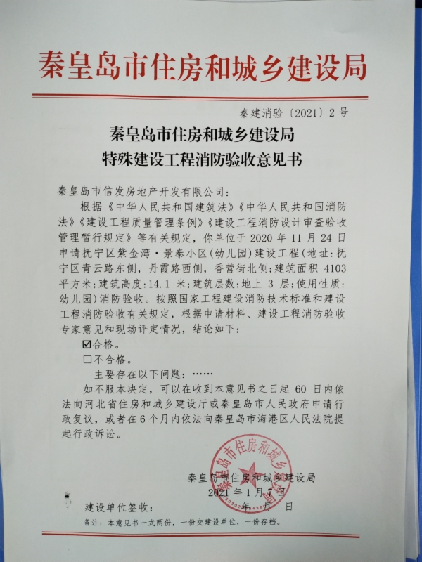 秦建消验﹝2021﹞2号建设工程消防验收意见书(抚宁区紫金湾▪景泰小区(幼儿园)项目)