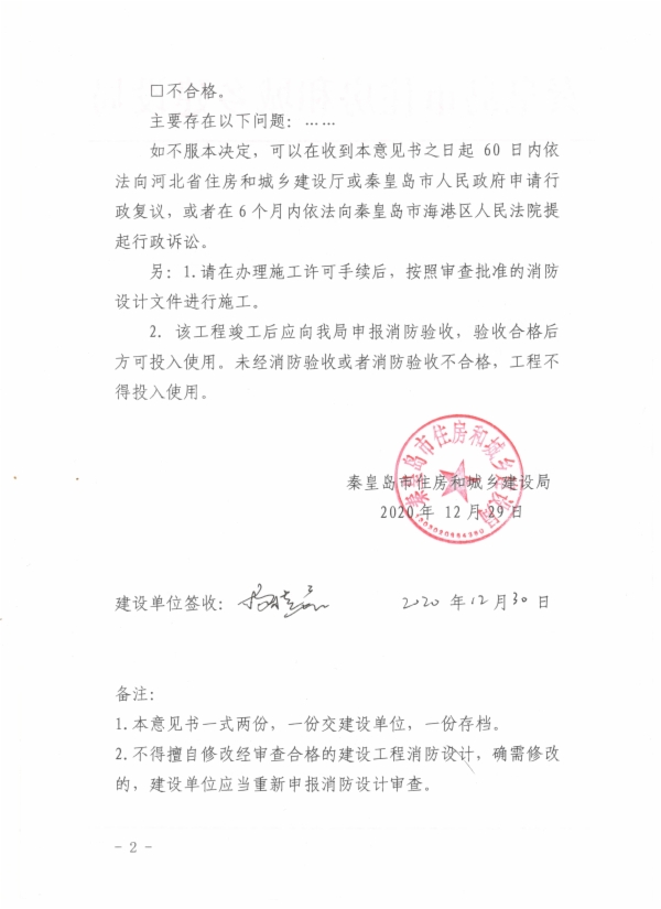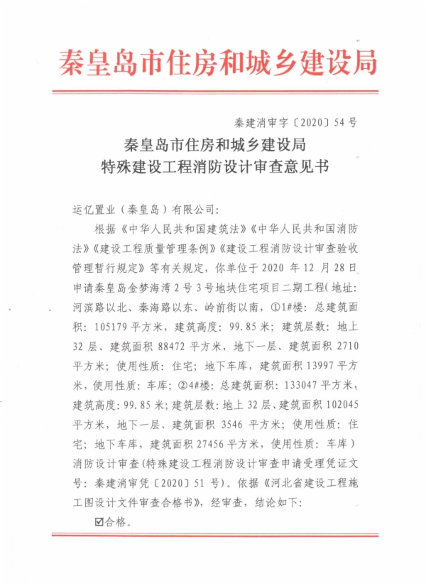 秦建消审字〔2020〕54号特殊建设工程消防设计审查意见书(秦皇岛金梦海湾2号3号地块住宅工程)