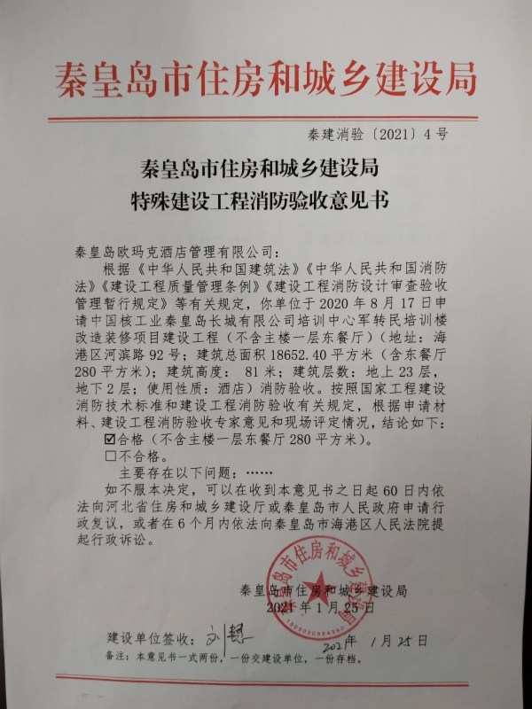 秦建消验﹝2021﹞4号特殊建设工程消防验收意见书(中国核工业秦皇岛长城有限公司培训中心军转民培训楼改造装修项目)