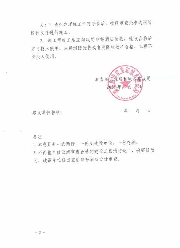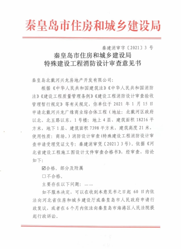 秦建消审字〔2021〕3号特殊建设工程消防设计审查意见书(北戴河兴龙广缘商业综合体工程)