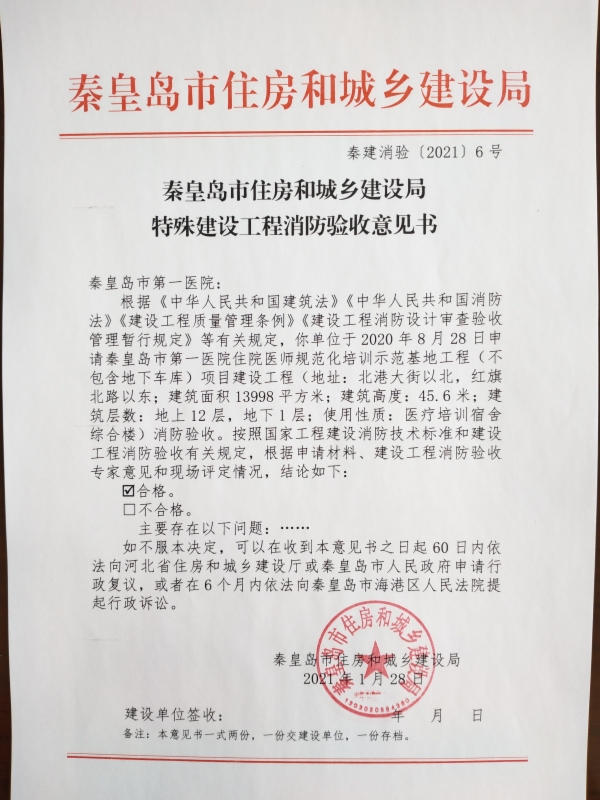 秦建消验﹝2021﹞6号特殊建设工程消防验收意见书(秦皇岛市第一医院住院医师规范化培训示范基地工程(不包含地下车库)项目)