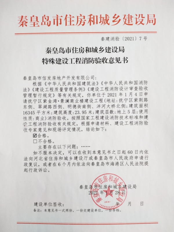 秦建消验﹝2021﹞7号特殊建设工程消防验收意见书(抚宁区紫金湾▪景澜商业楼建设工程)