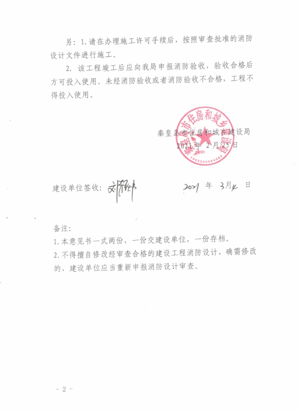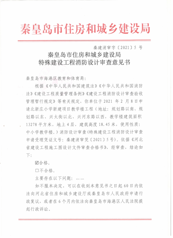 秦建消审字〔2021〕5号特殊建设工程消防设计审查意见书(北新庄小学新建项目教学楼工程)