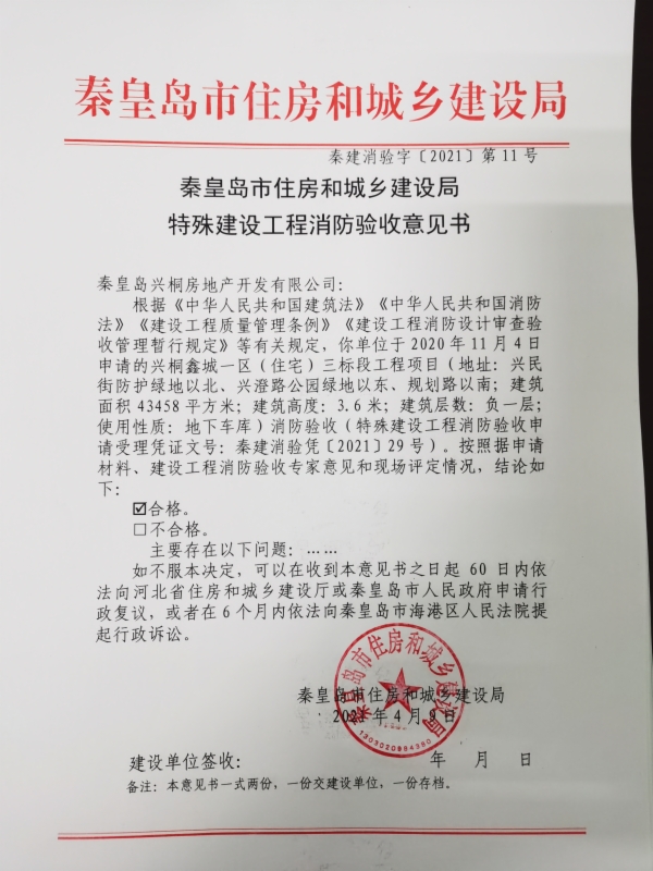 秦建消验字〔2021〕11号特殊建设工程消防验收意见书(兴桐鑫城一区(住宅)三标段工程项目)