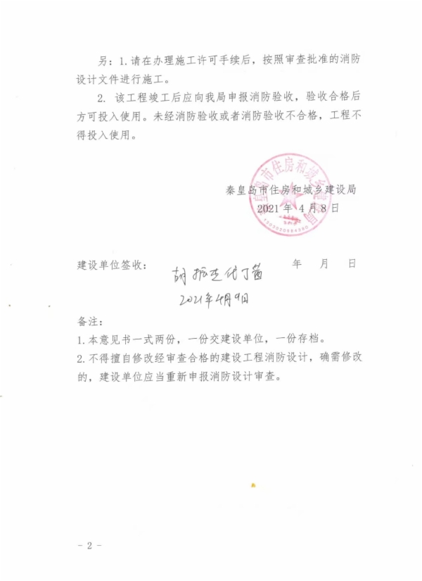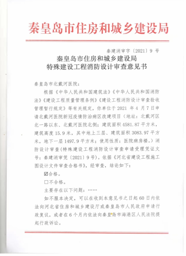 秦建消审字〔2021〕9号特殊建设工程消防设计审查意见书(北戴河医院新冠疫情防治病区改建项目)