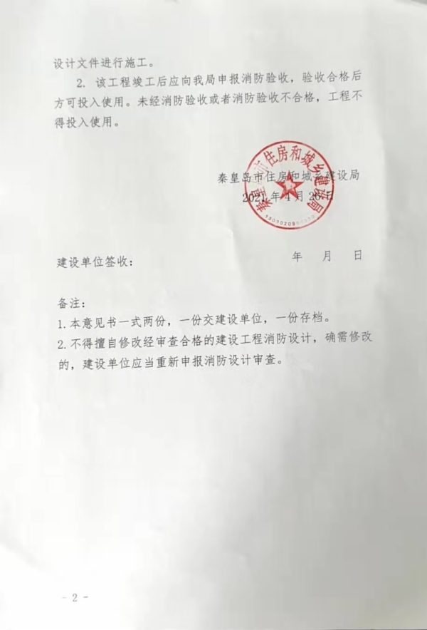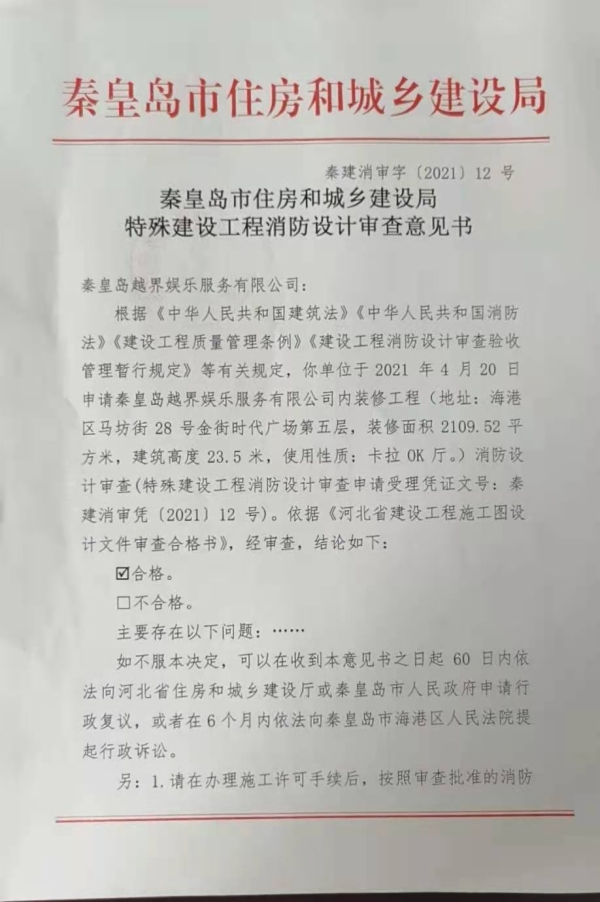秦建消审字〔2021〕12号特殊建设工程消防设计审查意见书(秦皇岛越界娱乐服务有限公司内装修工程)