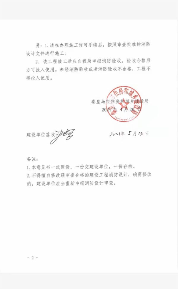 秦建消审字〔2021〕13号特殊建设工程消防设计审查意见书(海港区市场建设项目(和美市场)))