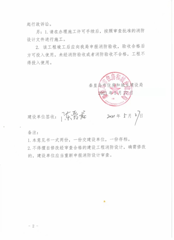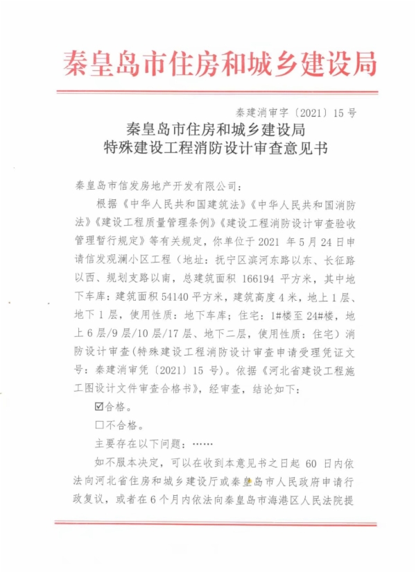 秦建消审字〔2021〕15号特殊建设工程消防设计审查意见书(信发观澜小区)
