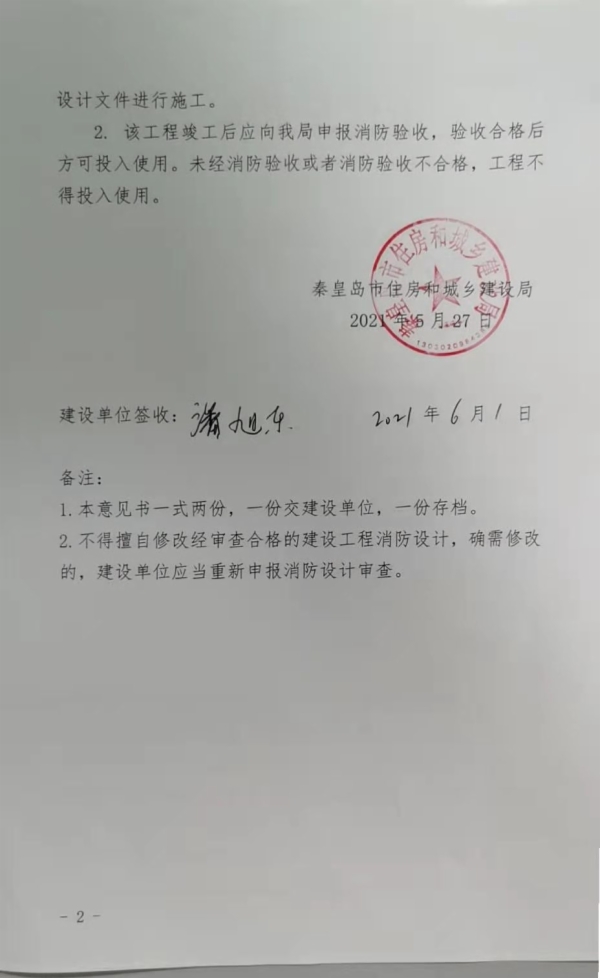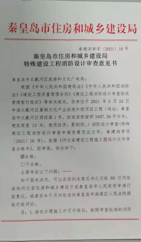 秦建消审字〔2021〕16号特殊建设工程消防设计审查意见书(北戴河区暑期文化产业改造升级项目)