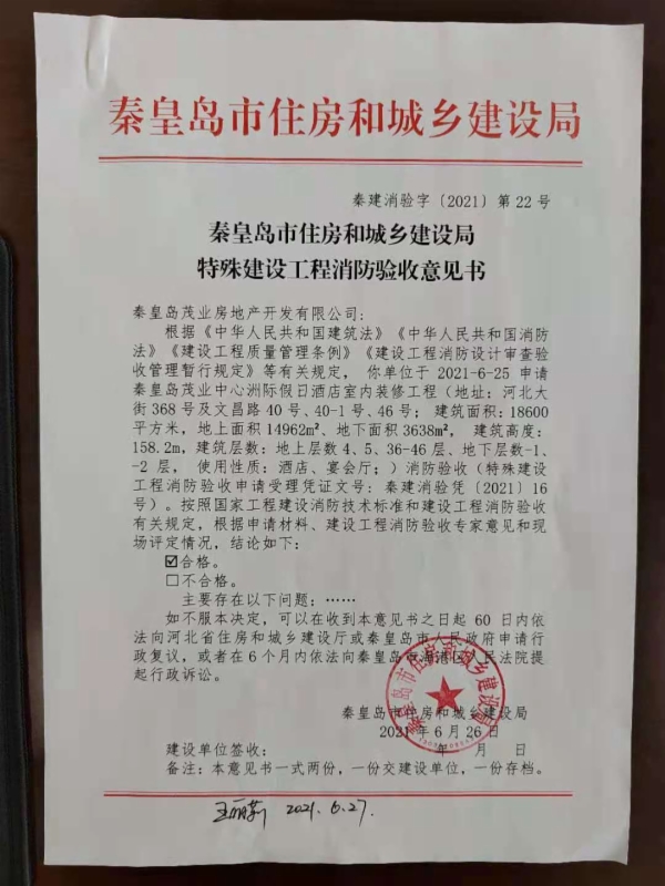 秦建消验字﹝2021﹞第22号特殊建设工程消防验收意见书(秦皇岛茂业中心洲际假日酒店室内装修工程)