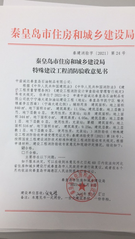 秦建消验字﹝2021﹞第24号特殊建设工程消防验收意见书(中益诚达秦皇岛石油制品有限公司抚宁宁海大道加油站建设工程)