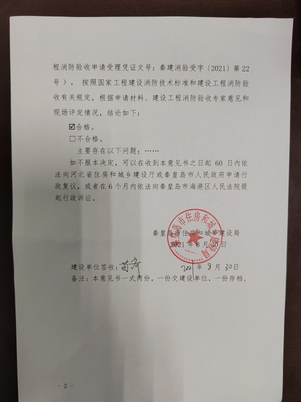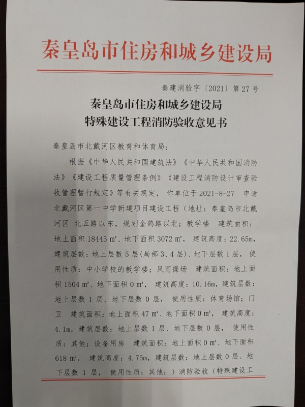 秦建消验字﹝2021﹞第27号特殊建设工程消防验收意见书(北戴河区第一中学新建项目)