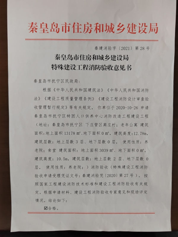 秦建消验字﹝2021﹞第28号特殊建设工程消防验收意见书(秦皇岛市抚宁区特困人口供养中心消防改造工程建设工程)