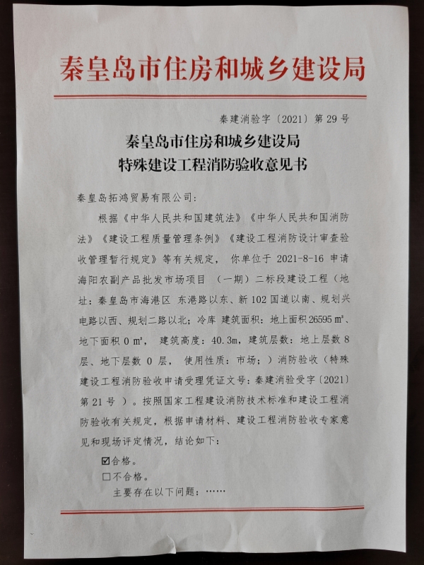 秦建消验字﹝2021﹞第29号特殊建设工程消防验收意见书(海阳农副产品批发市场项目(一期)二标段建设工程)