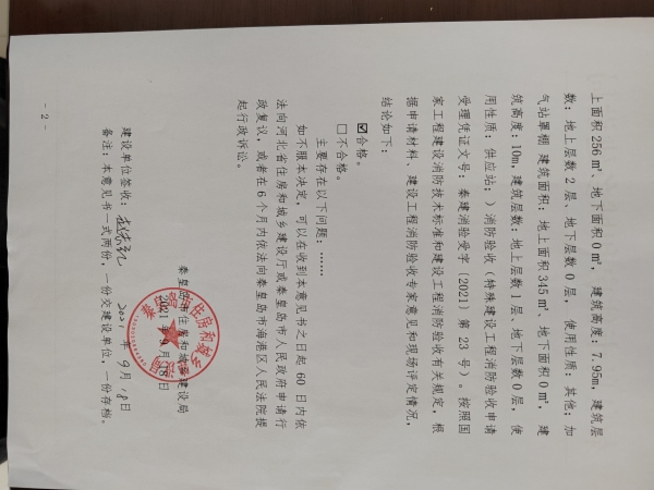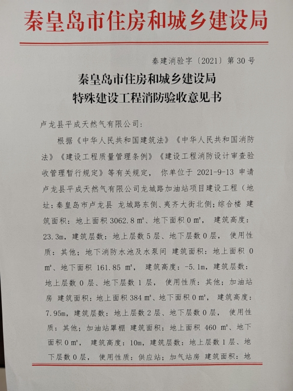 秦建消验字﹝2021﹞第30号特殊建设工程消防验收意见书(卢龙县平成天然气有限公司龙城路加油站项目建设工程)