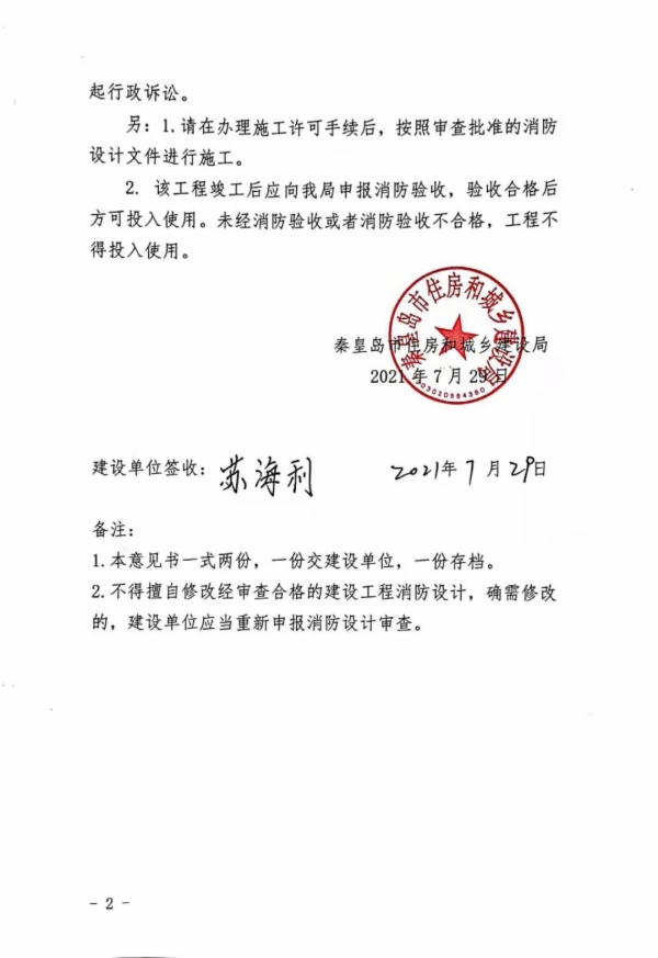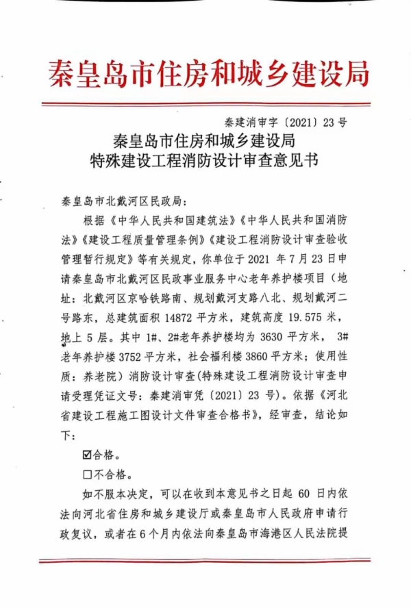 秦建消审字〔2021〕23号特殊建设工程消防设计审查意见书(北戴河区民政事业服务中心老年养护楼项目)