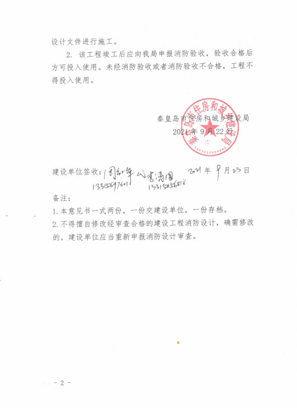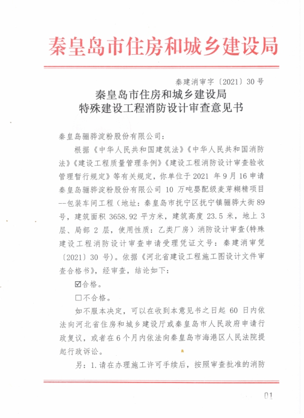 秦建消审字〔2021〕30号特殊建设工程消防设计审查意见书(秦皇岛骊骅淀粉股份有限公司10万吨婴配级麦芽糊精项目--包装车间工程)
