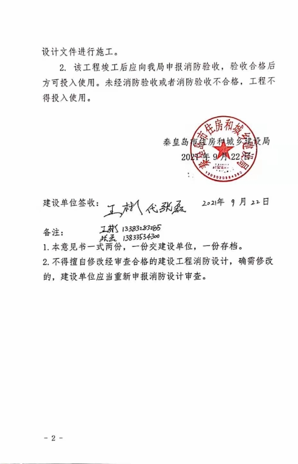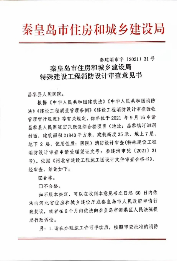 秦建消审字〔2021〕31号特殊建设工程消防设计审查意见书(昌黎县人民医院宏兴康复综合楼项目)