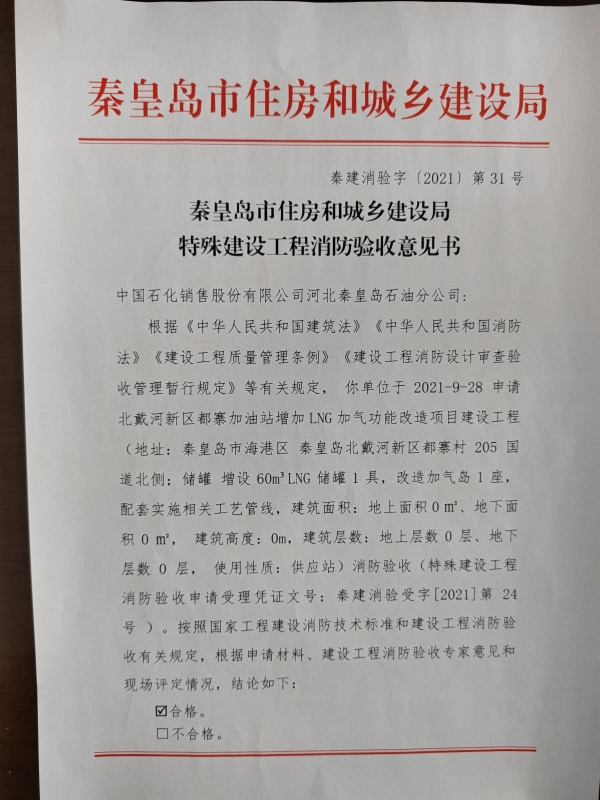 秦建消验字﹝2021﹞第31号特殊建设工程消防验收意见书(北戴河新区都寨加油站增设LNG加气功能改造项目建设工程)