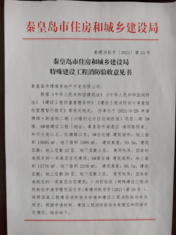 秦建消验字﹝2021﹞第33号特殊建设工程消防验收意见书(博维·新座标二期(兴隆村北片区旧城改造)项目二期5#楼、6#楼建设工程)