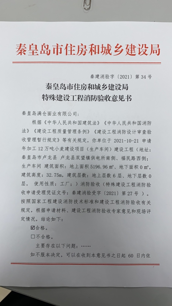 秦建消验字﹝2021﹞第34号特殊建设工程消防验收意见书(年加工12万吨小麦建设项目(生产车间)建设工程)