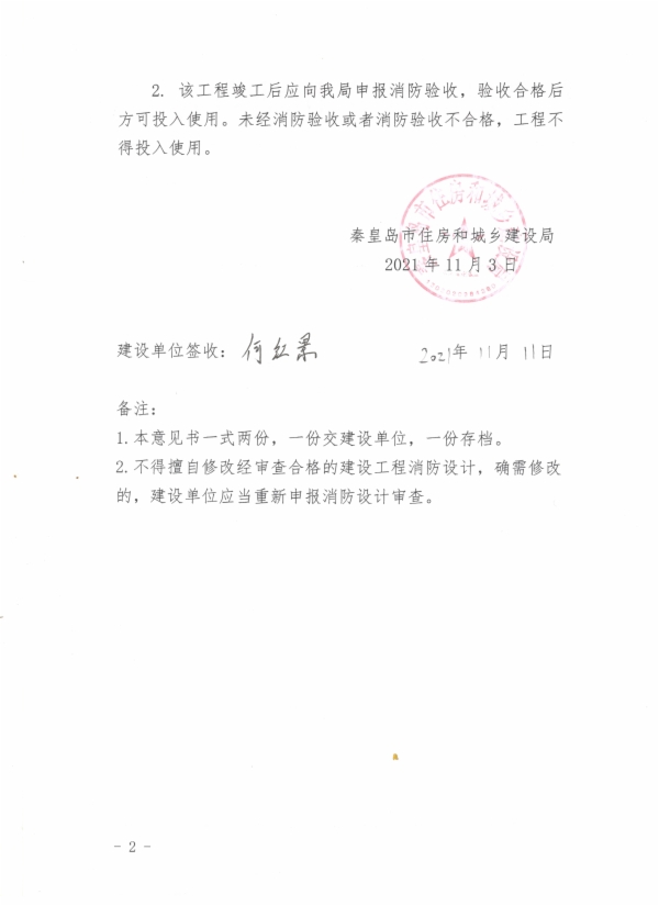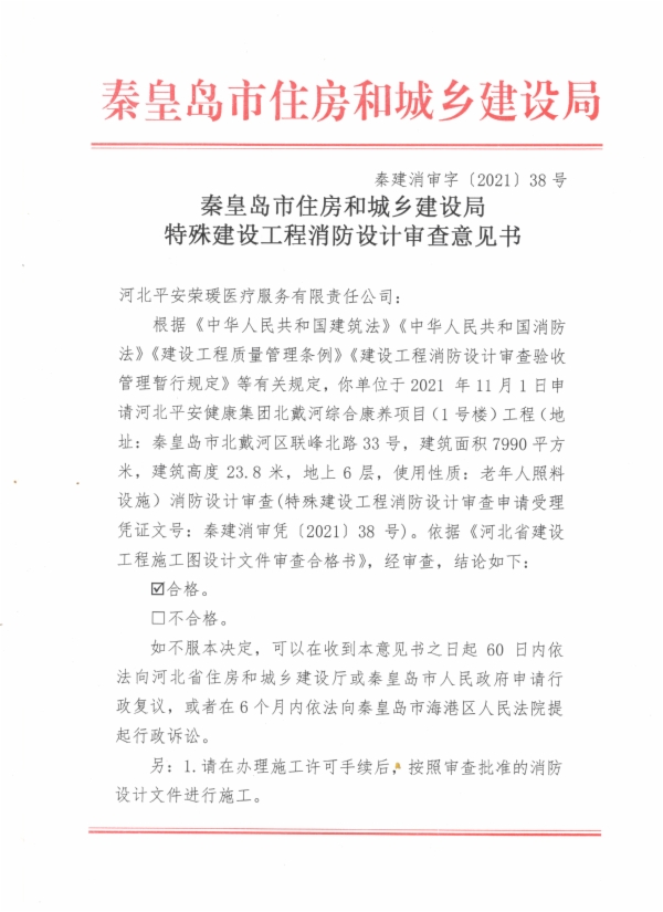 秦建消审字〔2021〕38号特殊建设工程消防设计审查意见书(河北平安健康集团北戴河综合康养项目(1号楼))