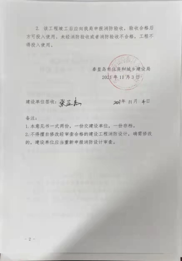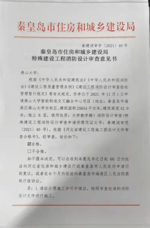 秦建消审字〔2021〕40号特殊建设工程消防设计审查意见书(燕山大学智能制造交叉融合中心项目)