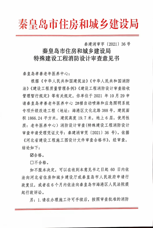 秦建消审字〔2021〕36号特殊建设工程消防设计审查意见书(秦皇岛孝善老年医养中心2#楼自动喷淋和应急照明系统专项升级改造工程)