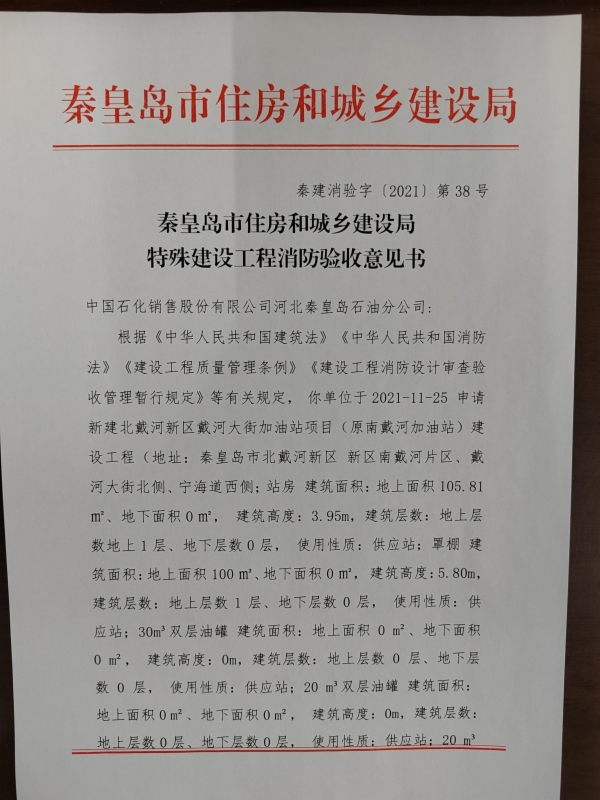秦建消验字﹝2021﹞第38号特殊建设工程消防验收意见书(新建北戴河新区戴河大街加油站项目(原南戴河加油站))