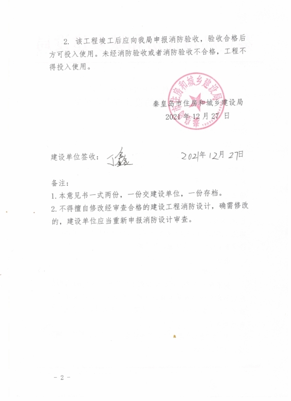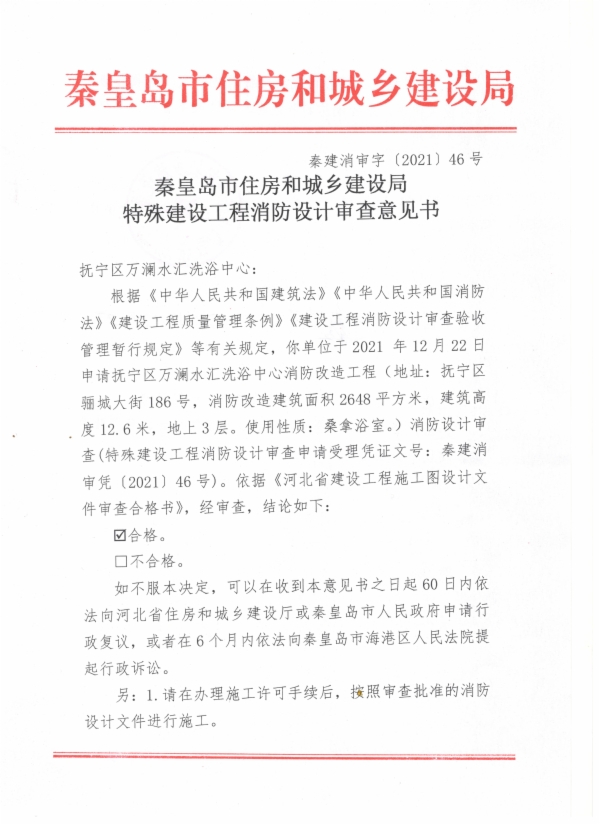 秦建消审字〔2021〕46号特殊建设工程消防设计审查意见书(抚宁区万澜水汇洗浴中心消防改造工程)