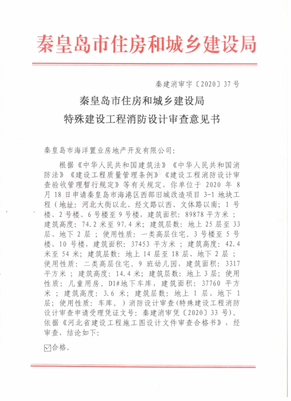 秦建消审字〔2020〕37号特殊建设工程消防设计审查意见书(秦皇岛市海港区西部旧城改造项目3-1地块)