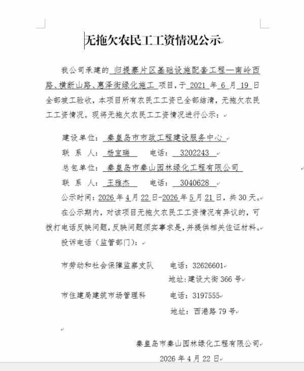 关于归提寨片区基础设施配套工程——南岭西路、横断山路、泽慧街绿化施工项目无拖欠农民工工资情况的公示